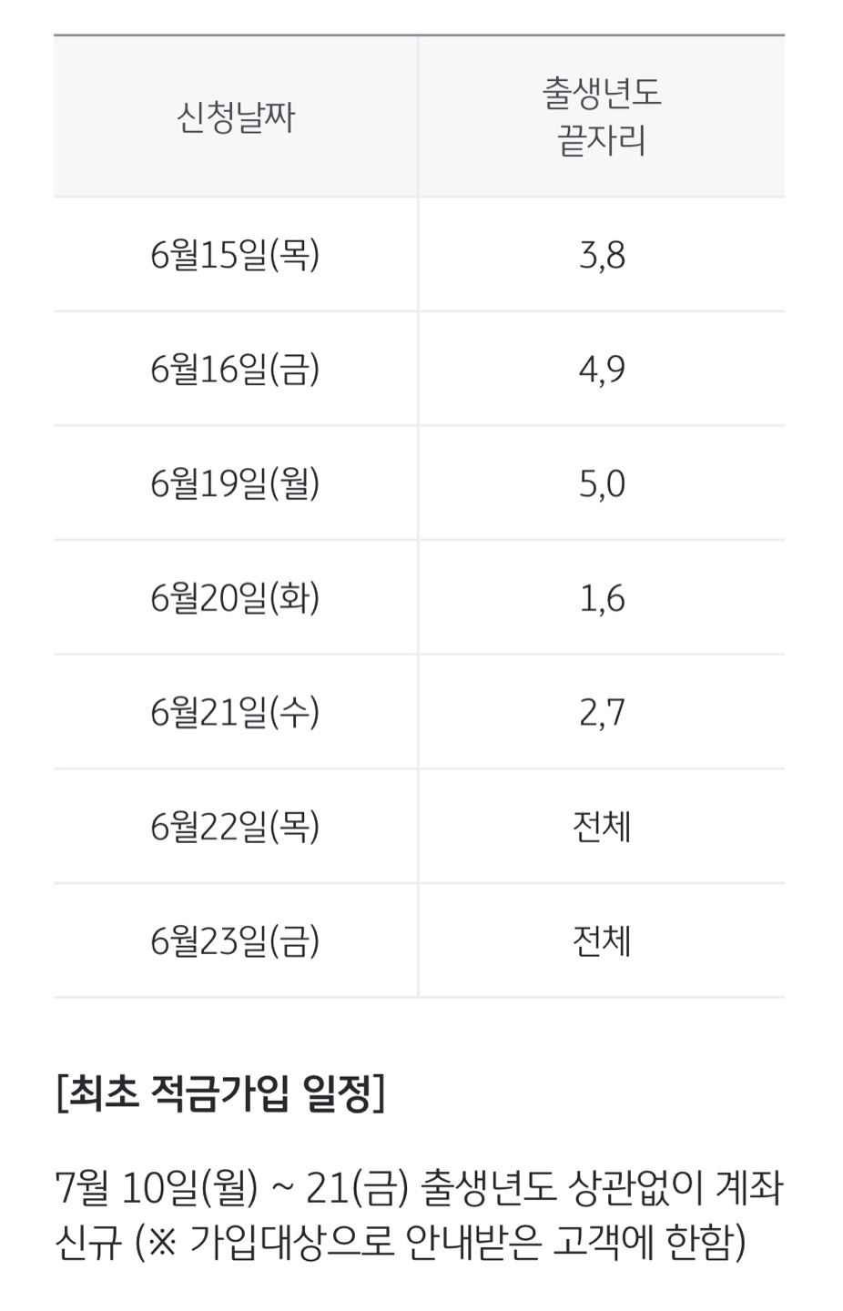 아래 표를 참고하여 해당 생년월일에 각 은행에서 신청 가능!